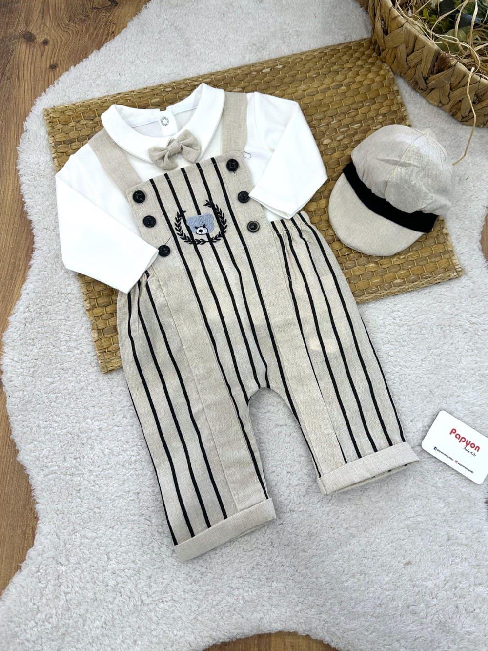 Ayıcık Nakışlı Salopetli Papyonlu Badili Erkek Bebek 2li Takım (0-3/3-6/6-9/9-12 Ay)