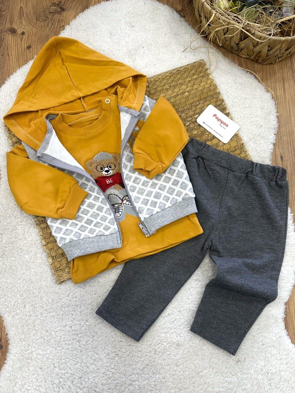 Bear Nakışlı Kapşonlu Yelekli Erkek Bebek 3lü Takım (6-9/9-12/12-18 Ay) (CARNAVAL/653/SARI)