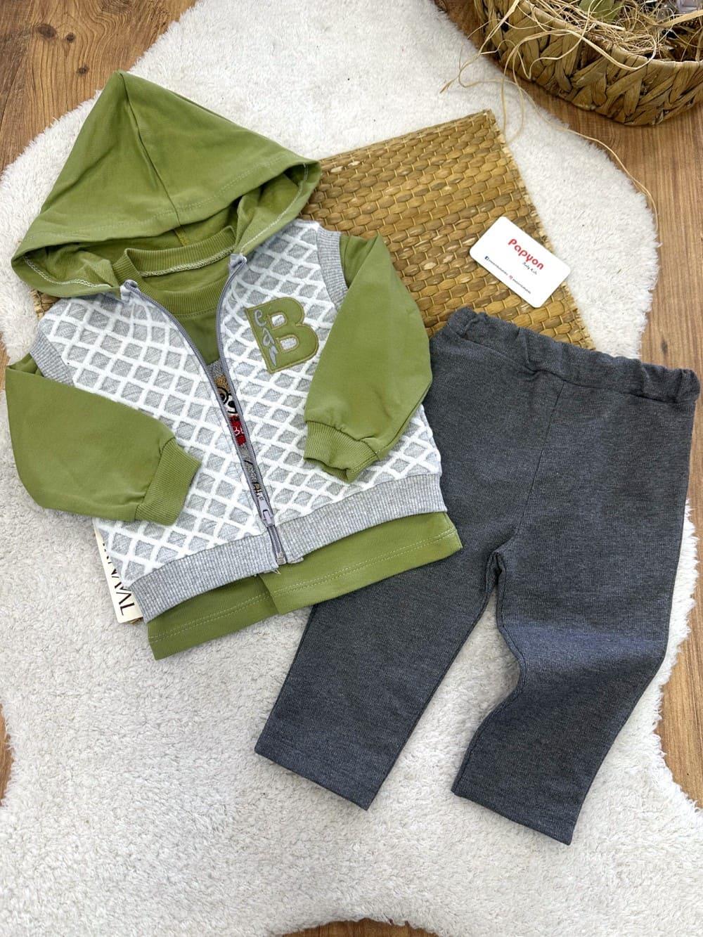 Bear Nakışlı Kapşonlu Yelekli Erkek Bebek 3lü Takım (6-9/9-12/12-18 Ay) (CARNAVAL/653/YESIL)