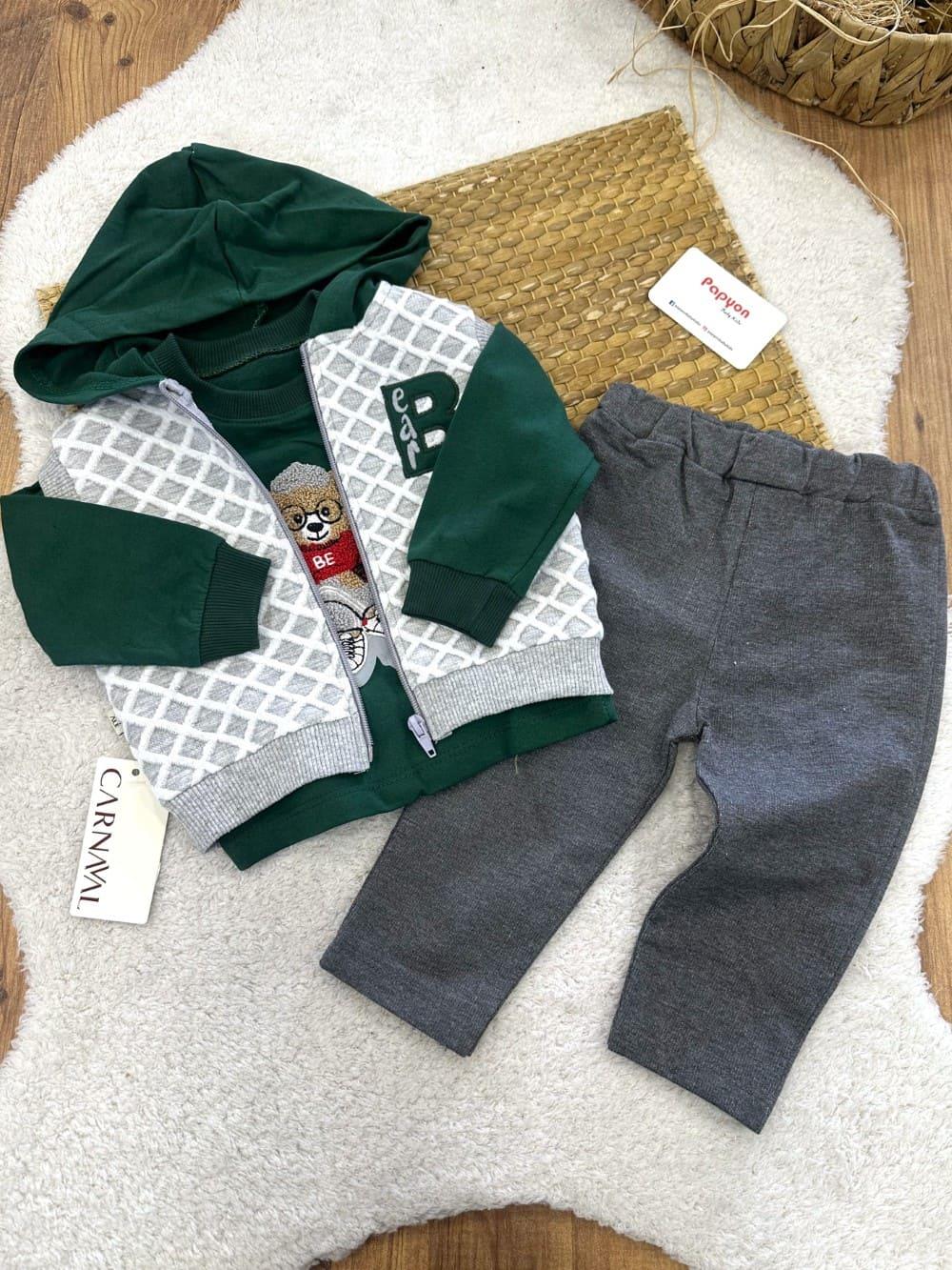 Bear Nakışlı Kapşonlu Yelekli Erkek Bebek 3lü Takım (6-9/9-12/12-18 Ay) (CARNAVAL/653/K.YESIL)