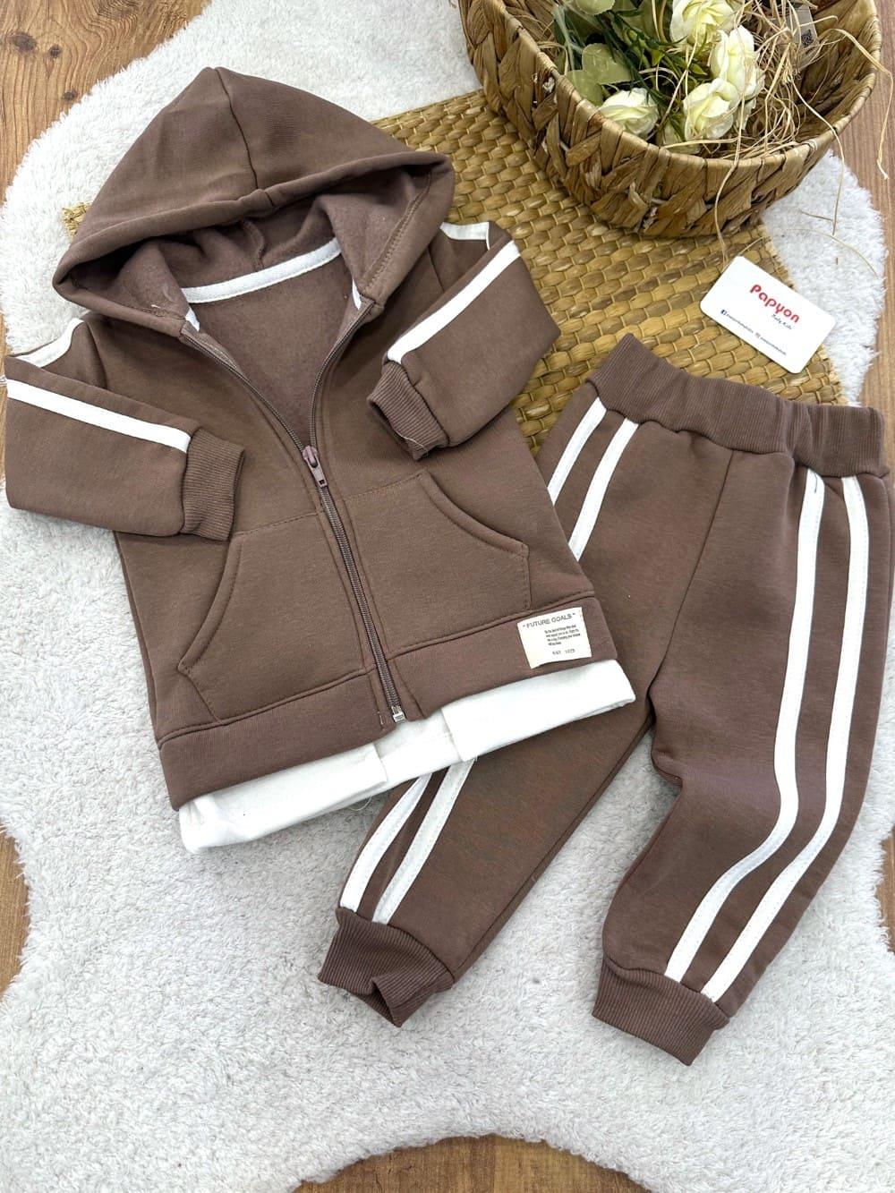 Cepli Kapşonlu Fermuarlı Ceketli Erkek Bebek 3ip Şardonlu Takım (6-9/9-12/12-18/18-24 Ay) (MURAT/10025/KAHVE)