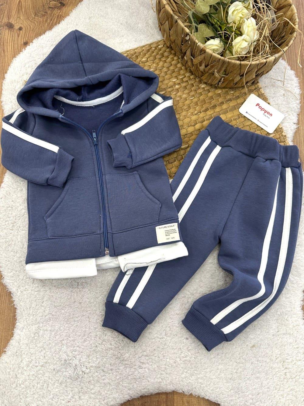 Cepli Kapşonlu Fermuarlı Ceketli Erkek Bebek 3ip Şardonlu Takım (6-9/9-12/12-18/18-24 Ay) (MURAT/10025/K.MAVI)
