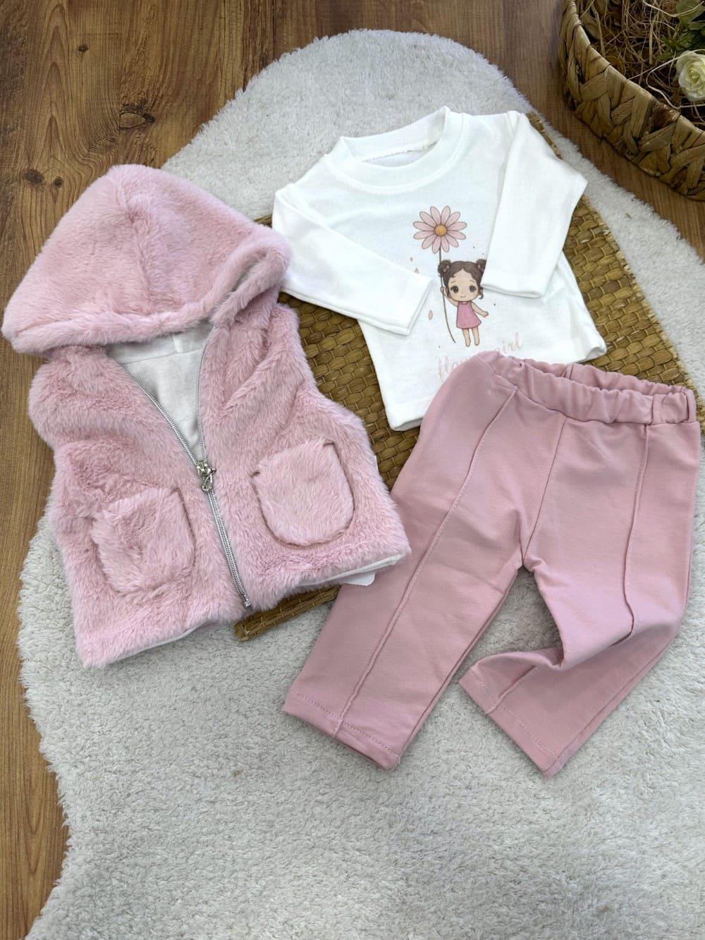 Cepli Kapşonlu Peluş Yelekli Kız Bebek 3lü Takım (3-6/6-9/9-12/12-18 Ay)
