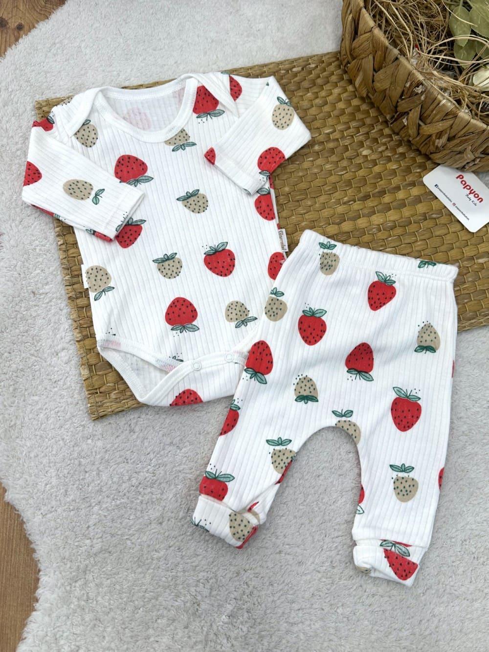 Çilek Desenli Fitilli Badili Bebek Takım (0-3/3-6/6-9 Ay)