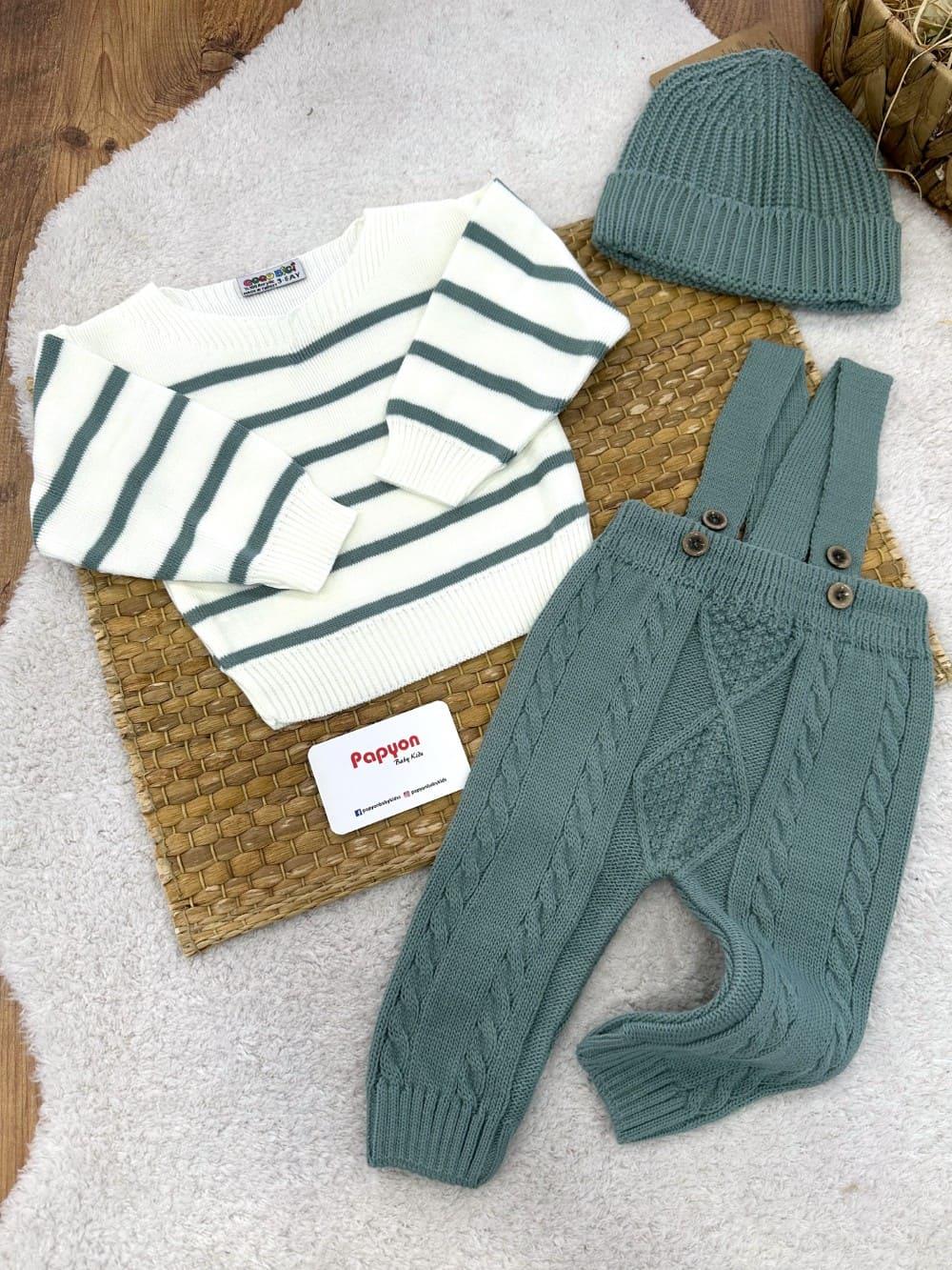 Çizgili Kazaklı Bereli Erkek Bebek Triko Salopet Takım (3-6/9-12/12-18 Ay) (GUNSAN/6424/YESIL)
