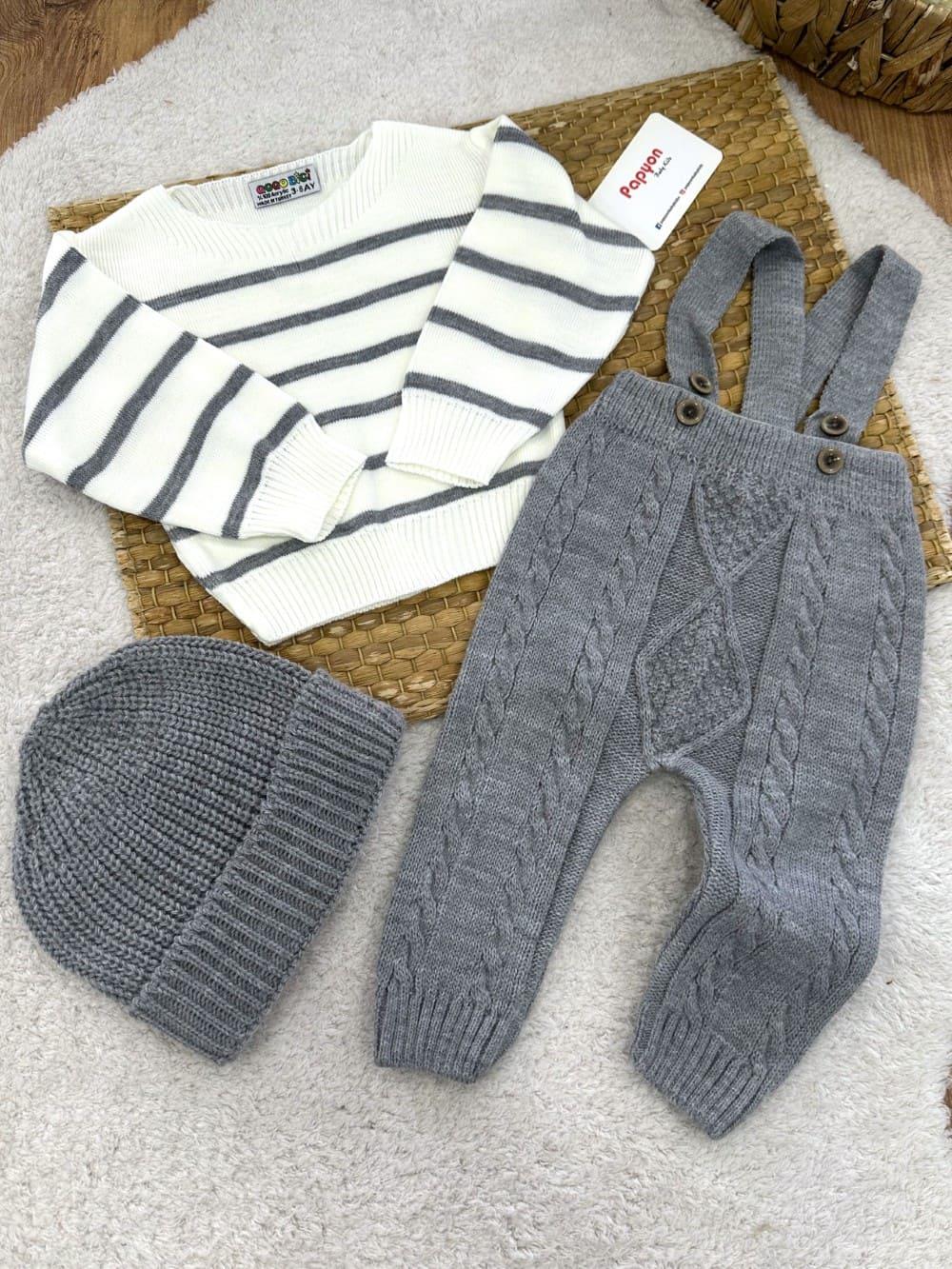 Çizgili Kazaklı Bereli Erkek Bebek Triko Salopet Takım (3-6/9-12/12-18 Ay) (GUNSAN/6424/GRI)