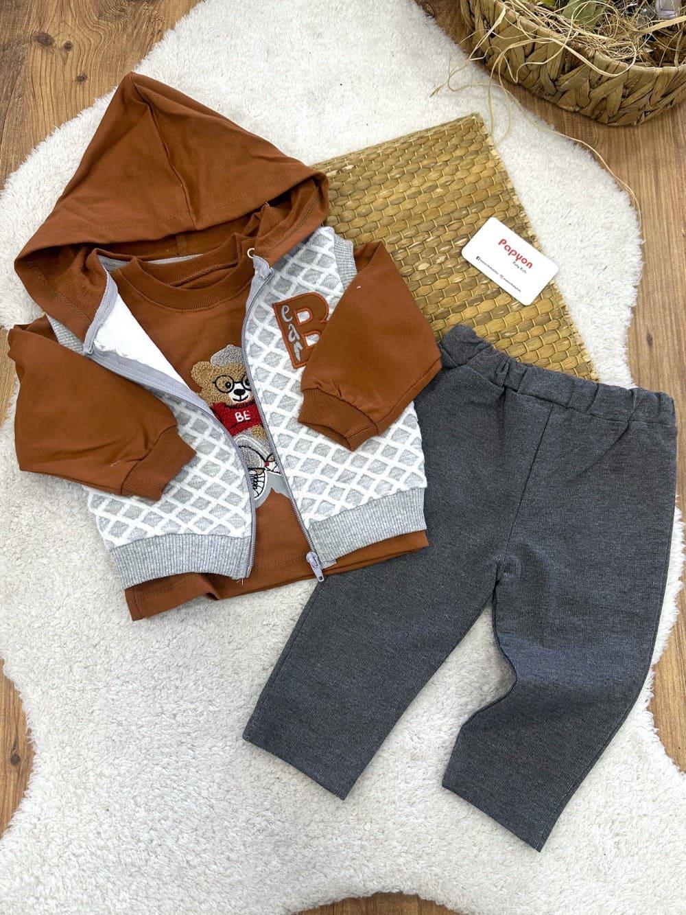 Bear Nakışlı Kapşonlu Yelekli Erkek Bebek 3lü Takım (6-9/9-12/12-18 Ay) (CARNAVAL/653/KAHVE)