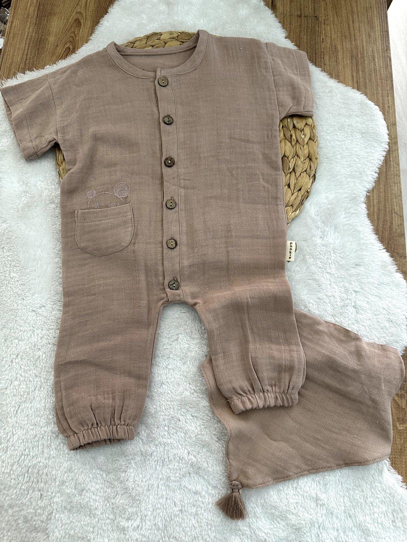 Cepli Organik Müslin Erkek Bebek Önlük Tulum Set 6-12-18 Ay (POOKIE/4005/VIZON)