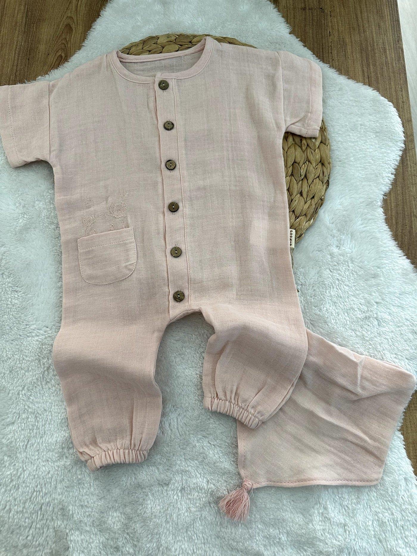 Cepli Organik Müslin Kız Bebek Önlük Tulum Set 6-12-18 Ay