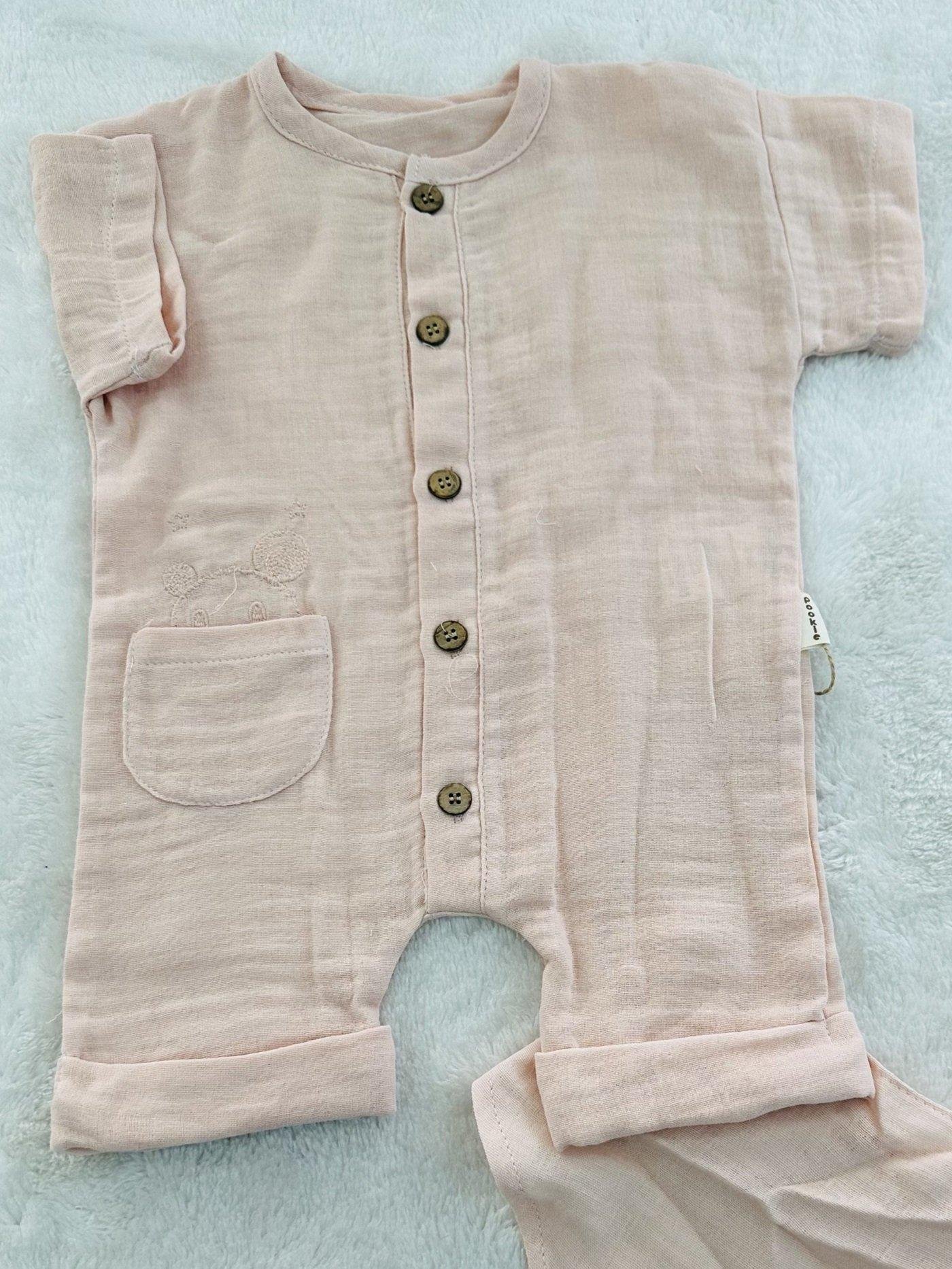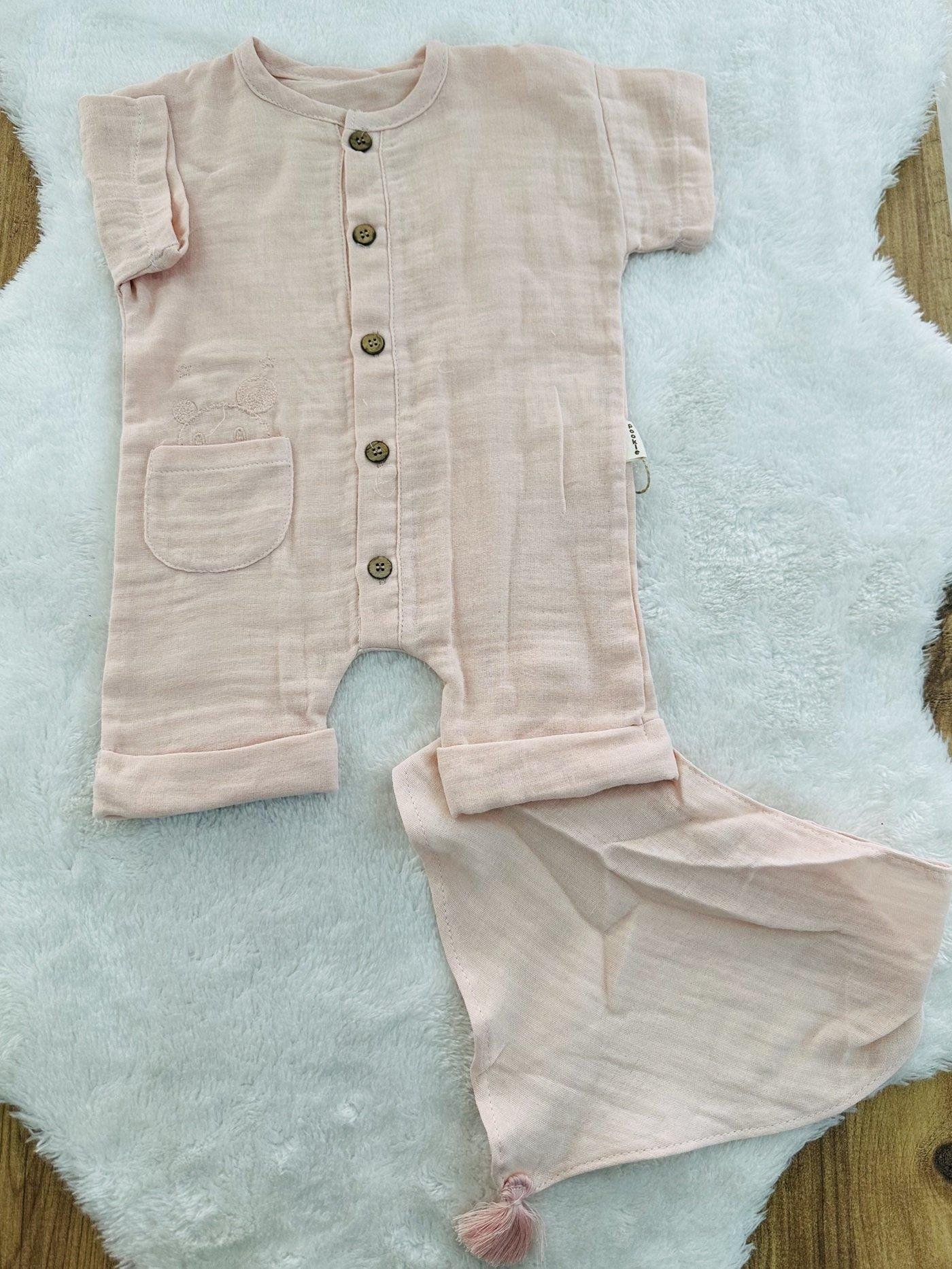 Cepte Ayıcık Nakışlı Kız Bebek Organik Müslin Fularlı Şort Tulum 6-12-18 Ay