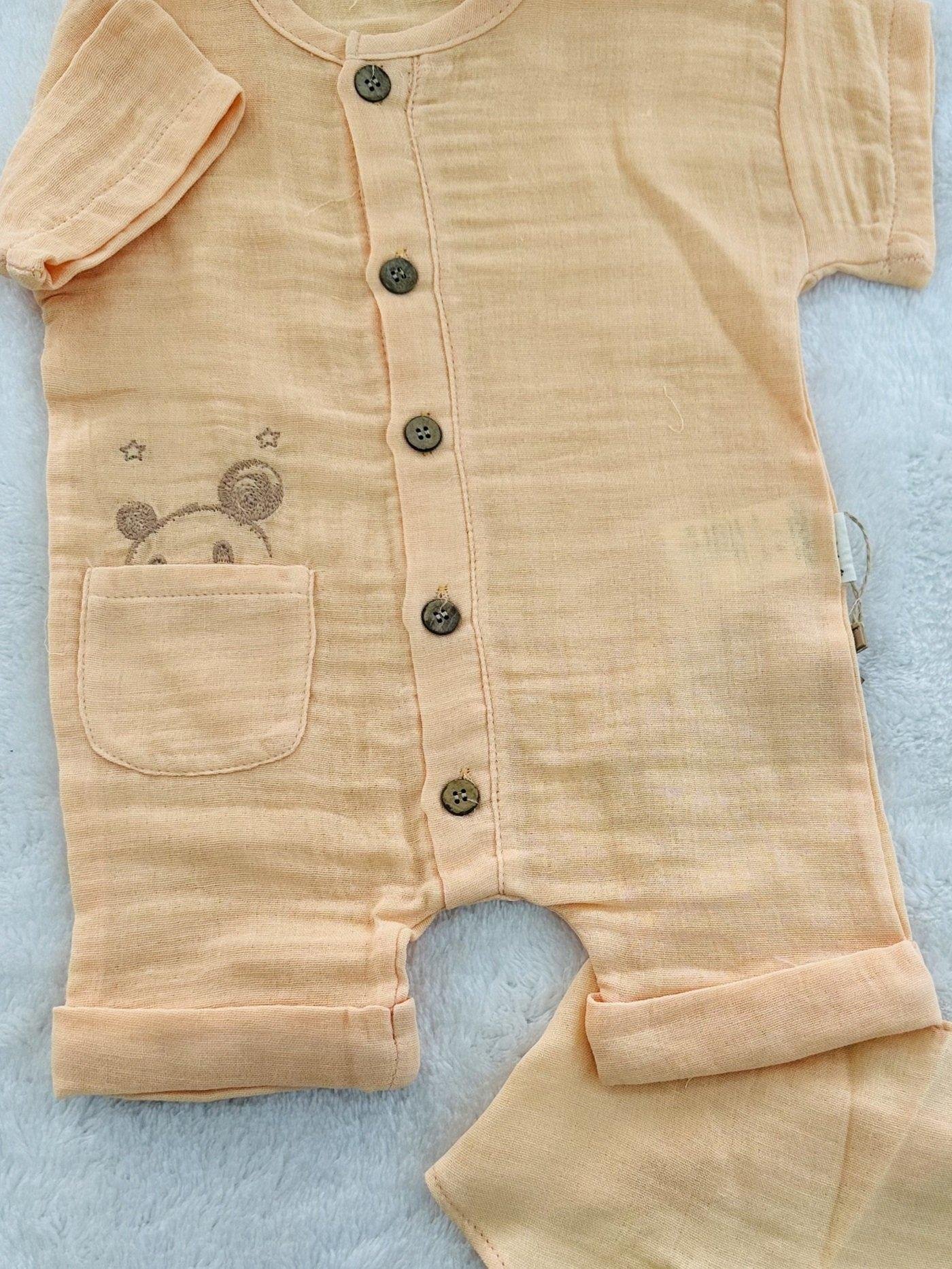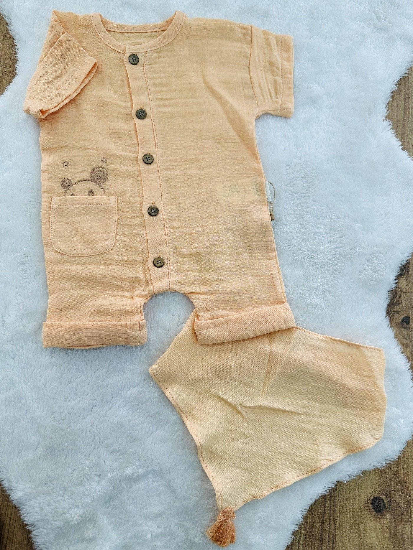 Cepte Ayıcık Nakışlı Uniseks Bebek Organik Müslin Fularlı Şort Tulum 6-12-18 Ay