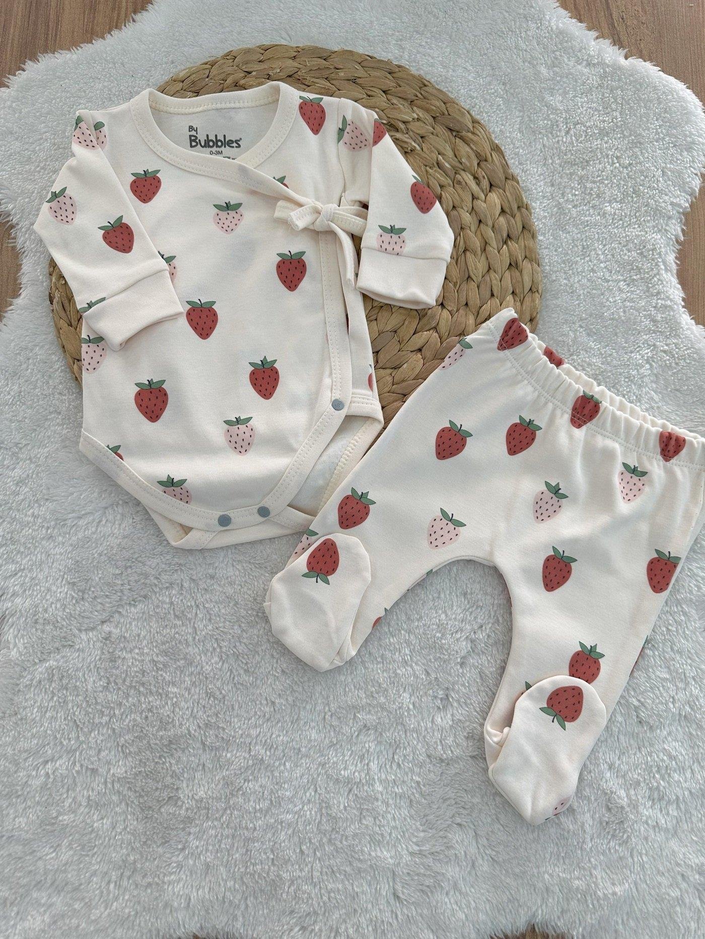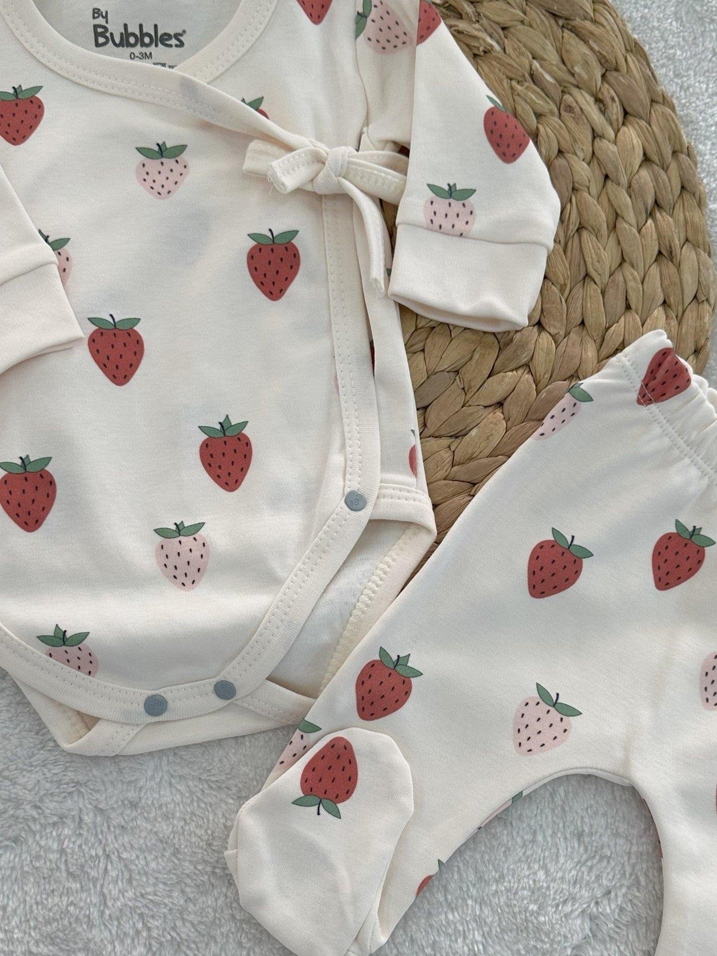 Çilek Baskılı Kruvaze Badili Kız Bebek Takım 0-3/3-6/6-9 Ay