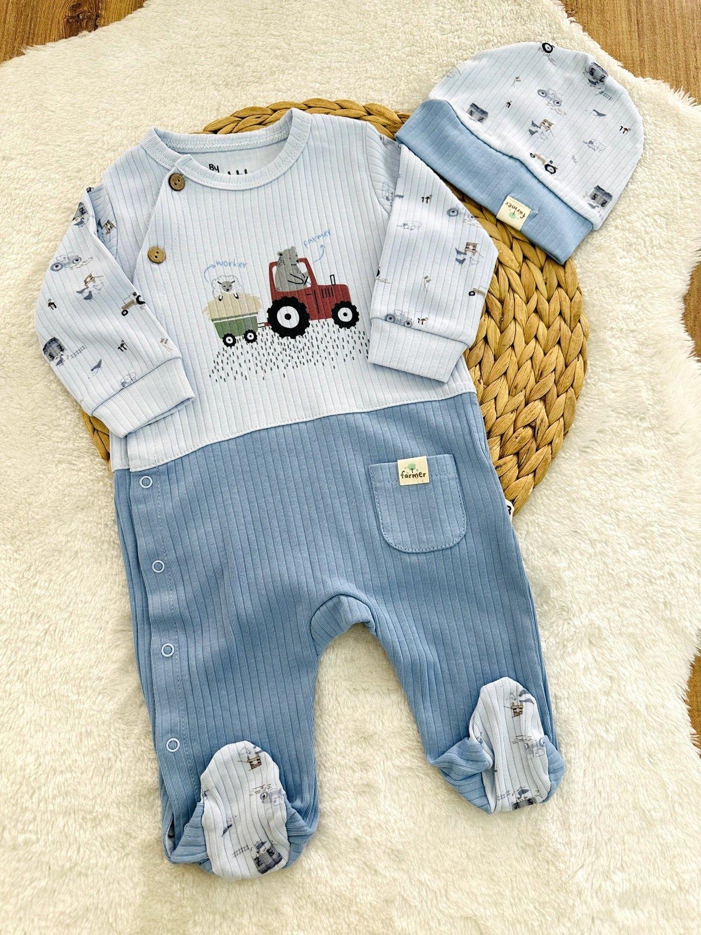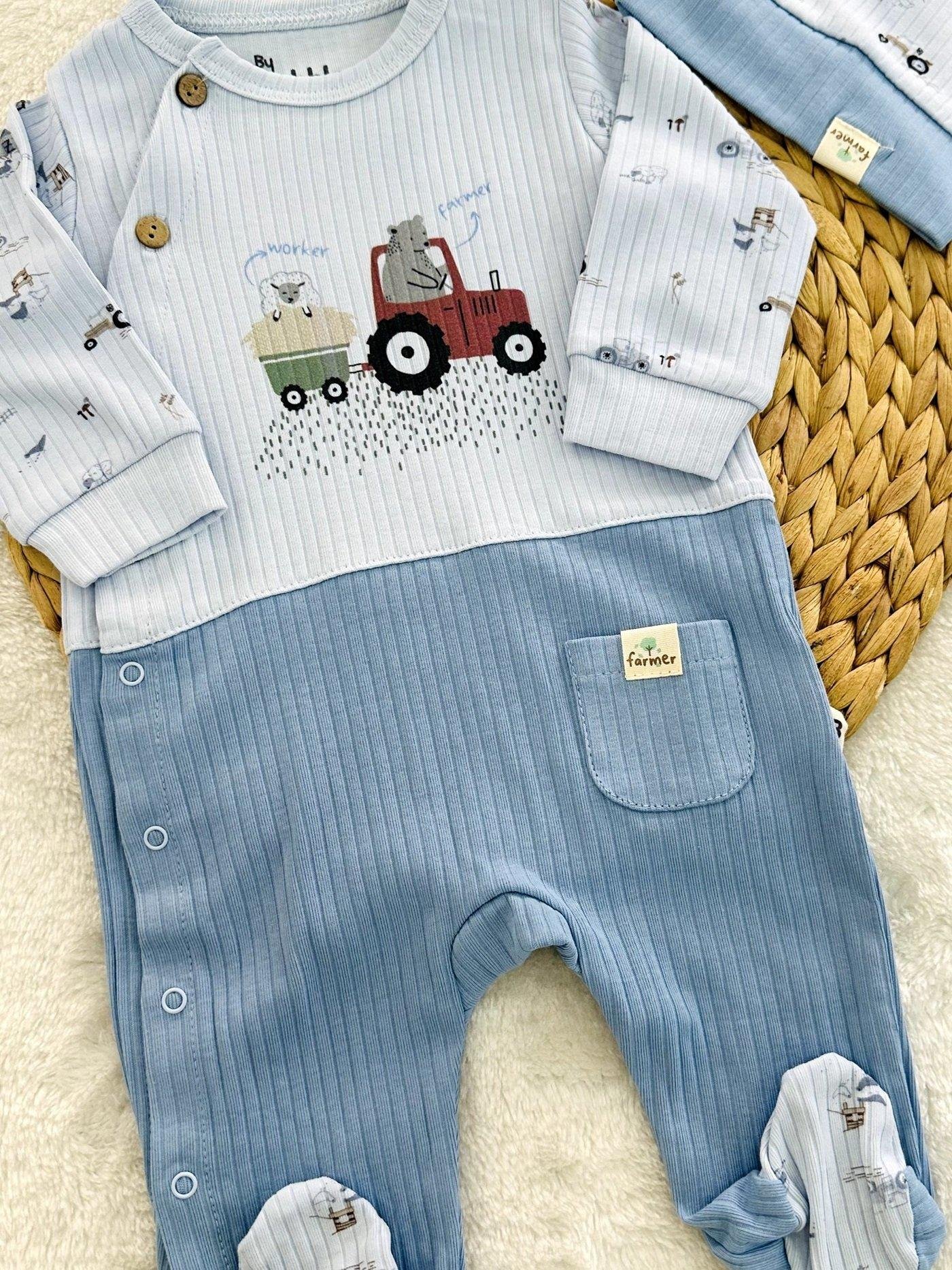 Farmer Traktör Erkek Bebek Organik Patikli Tulum Bere Set 0-3/3-6/6-9 Ay