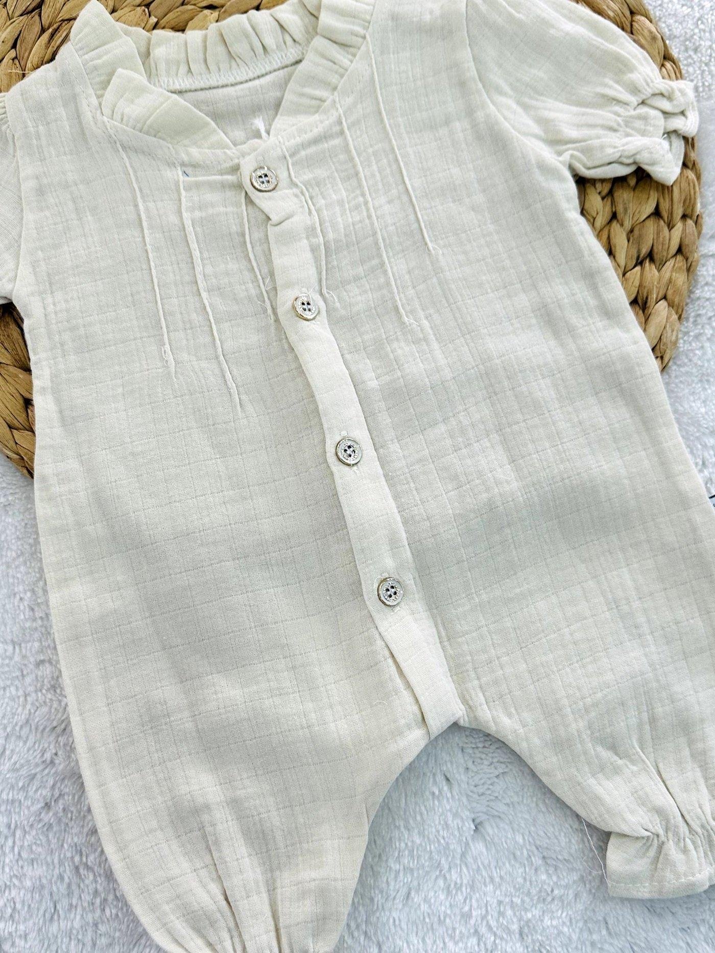 Fırfırlı Çimalı Kız Bebek Organik Yazlık Müslin Tulum 3-6/6-9/9-12/12-18 AY (ZEO/103/EKRU)