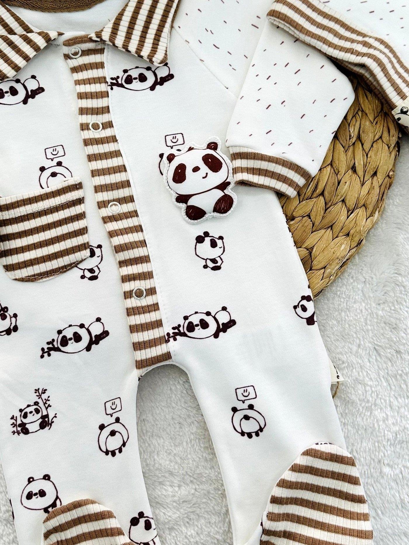 Panda Kabartmalı Bereli Erkek Bebek Organik Tulum Set 0-3/3-6/6-9 Ay