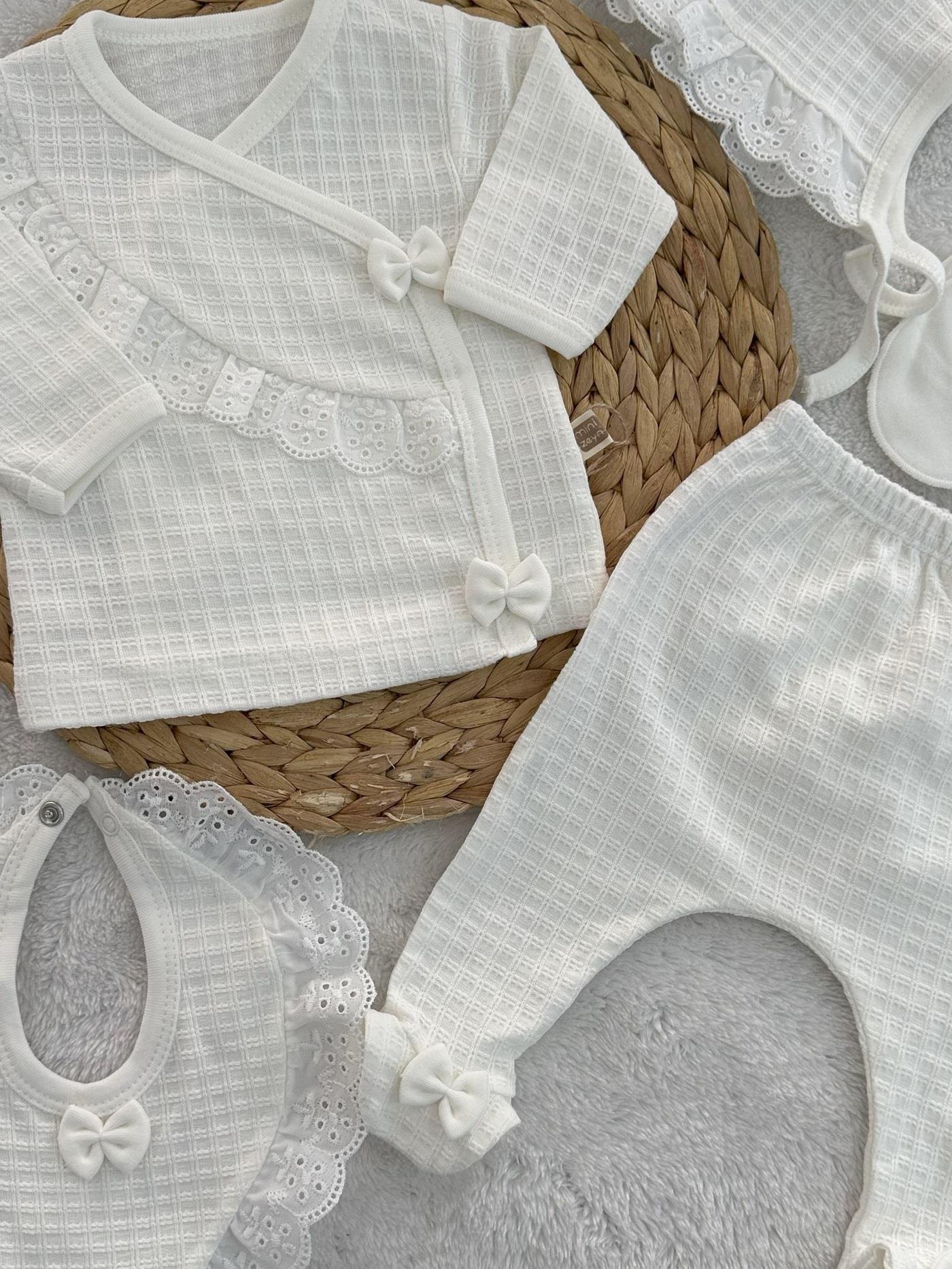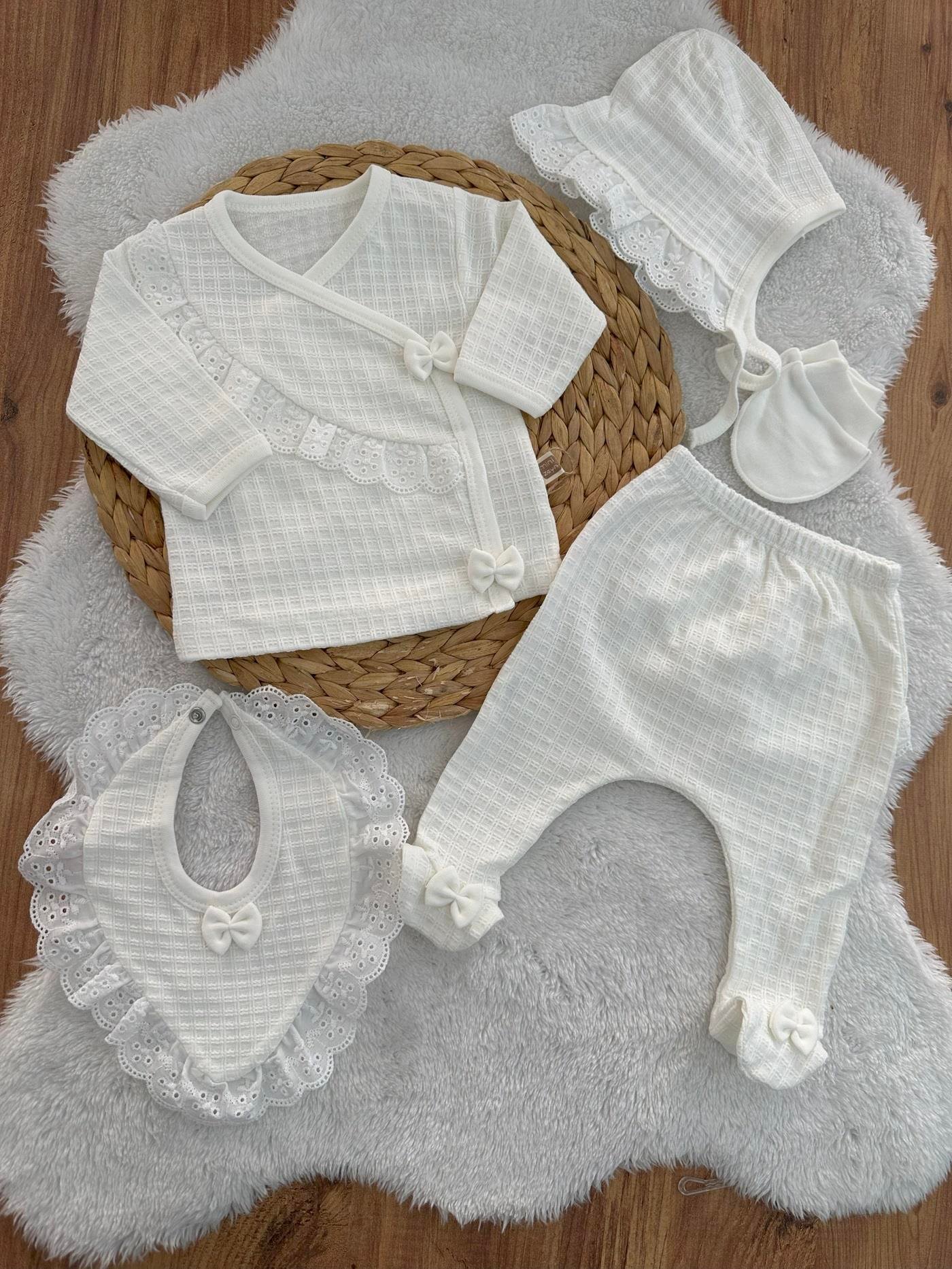 Pretty Girl Güpürlü Fiyonklu Yenidoğan Kız Bebek Organik 5li Zıbın Set