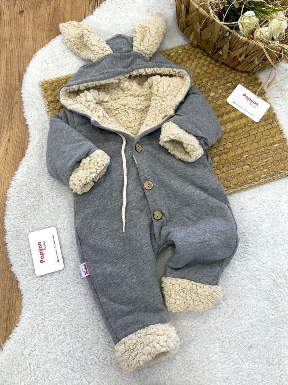 İçi Welsfot Tavşan Kulaklı Kapşonlu Düğmeli Bebek Tulum (6-9/9-12/12-18/18-24 Ay) (MURAT/7607/GRI)