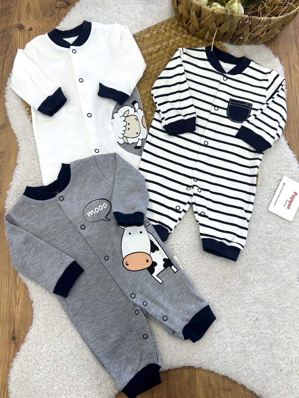 İnek Kuzu Baskılı Erkek Bebek 3lü Manşetli Tulum (0-3/3-6/6-9 Ay)