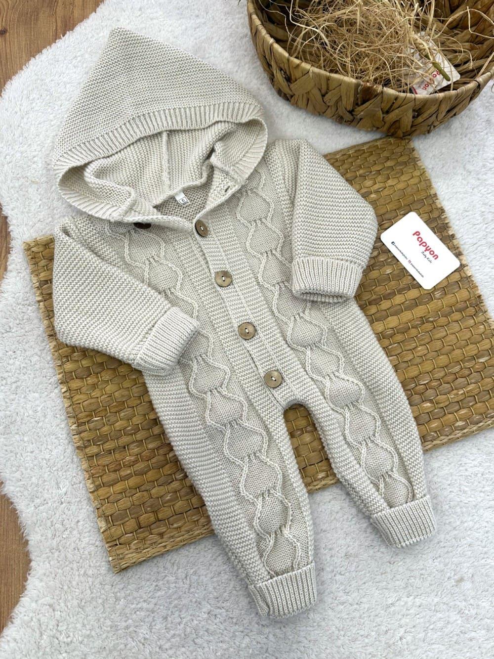 Kapşonlu Triko Örgü Bebek Tulum (3-6/6-9/9-12 Ay)