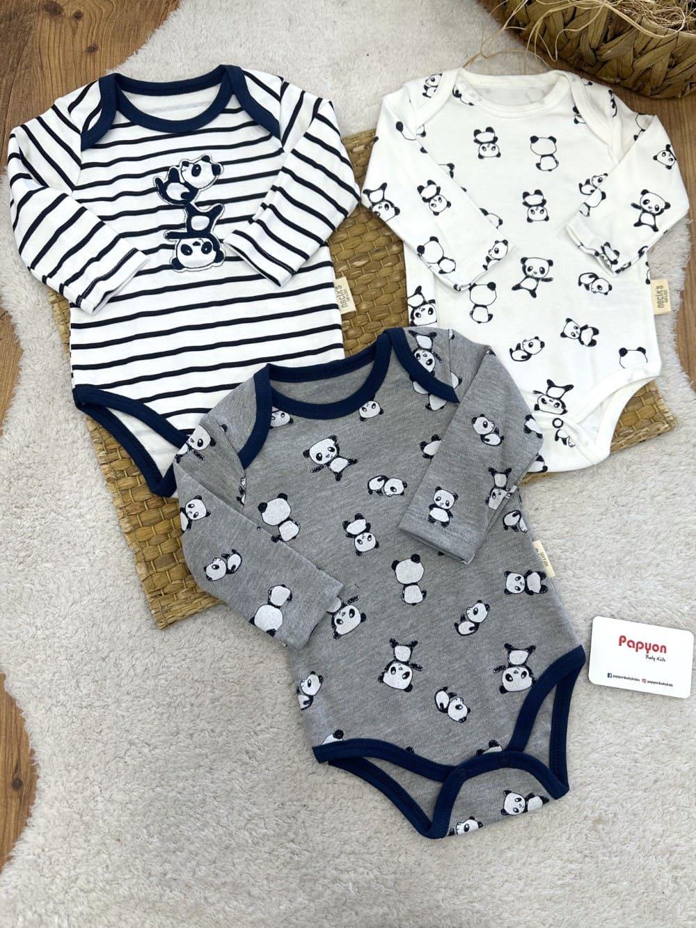 Panda Baskılı Çizgili Uniseks Bebek Uzun Kollu 3lü Çıtçıtlı Badi (0-3/3-6/6-9 Ay)