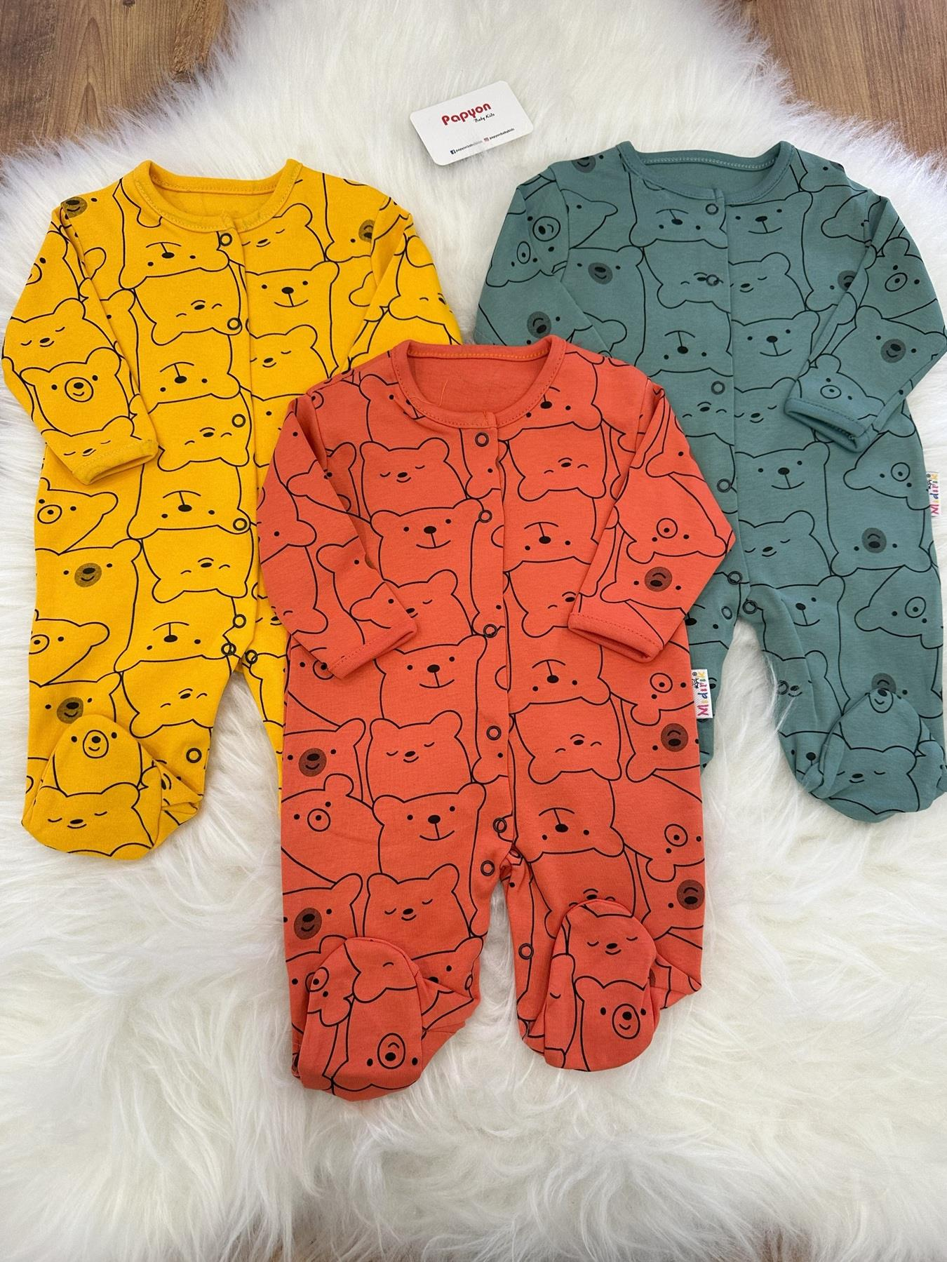 Renkli Ayılar Baskılı Uniseks Bebek Patikli 3lü Tulum 0-3/3-6/6-9 Ay