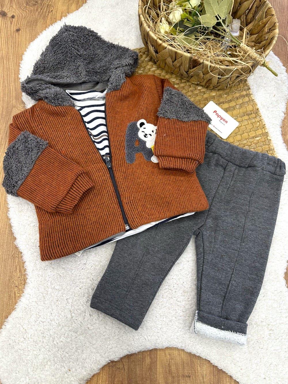 Süzene Ayıcık Nakışlı Kapşonlu Ceketli Erkek Bebek 3lü Takım (6-9/9-12/12-18 Ay)