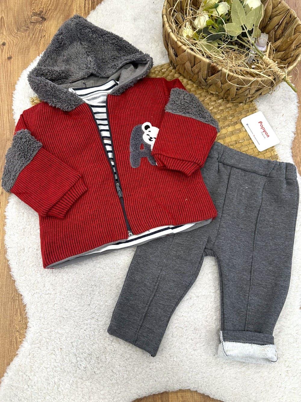 Süzene Ayıcık Nakışlı Kapşonlu Ceketli Erkek Bebek 3lü Takım (6-9/9-12/12-18 Ay) (CARNAVAL/610/KIRMIZI)