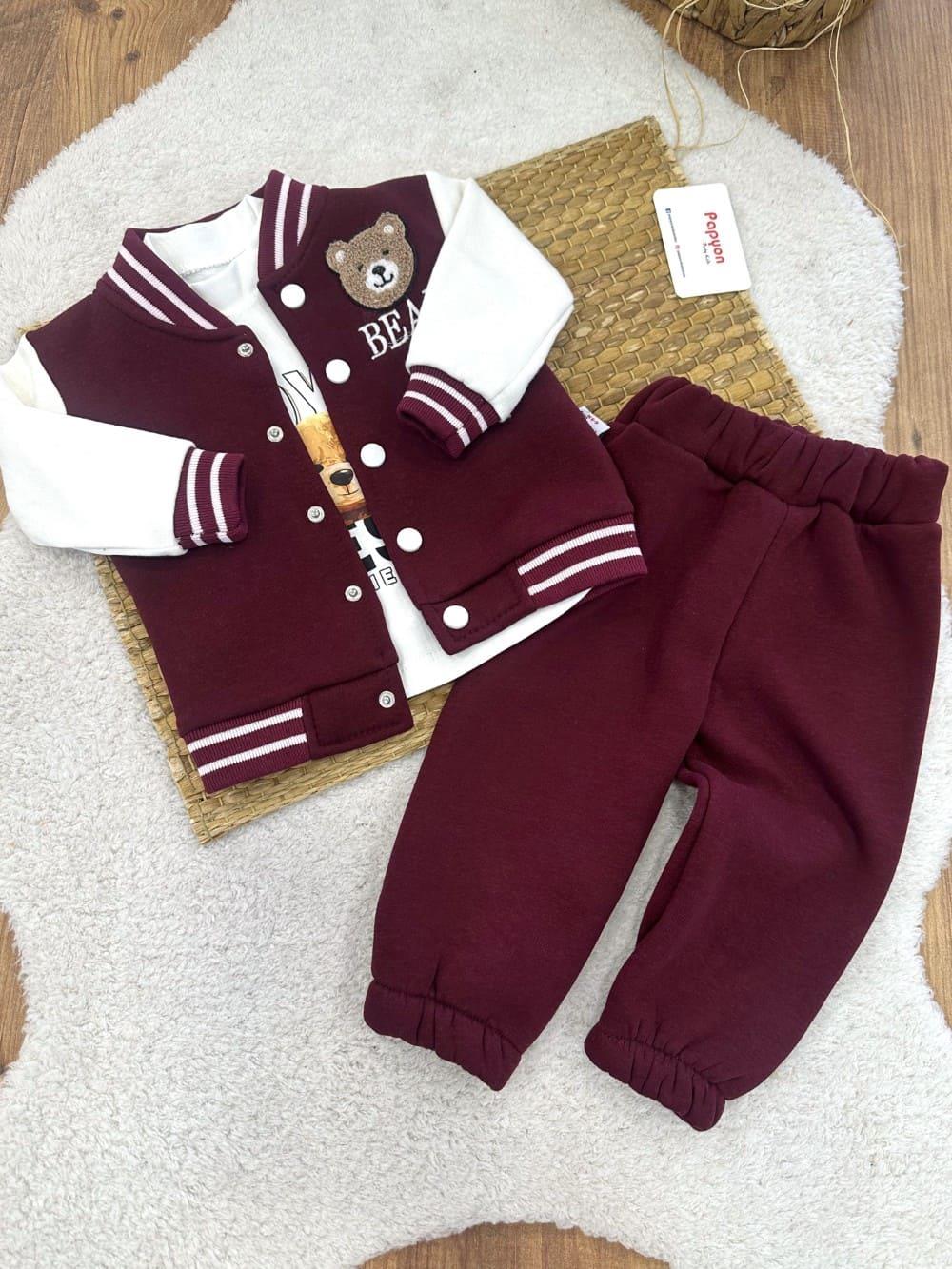 Süzene Ayıcık Nakışlı Kolej Ceketli 3ip Şardonlu Erkek Bebek 3lü Takım (6-9/9-12/12-18/18-24 Ay) (MURAT/10041/BORDO)