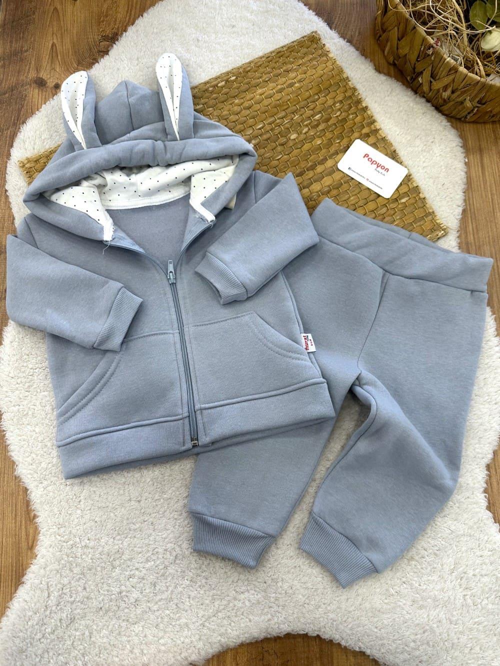 Tavşan Kulaklı Kapşonlu Ceketli Erkek Bebek 3ip Şardonlu Takım (6-9/9-12/12-18/18-24 Ay)
