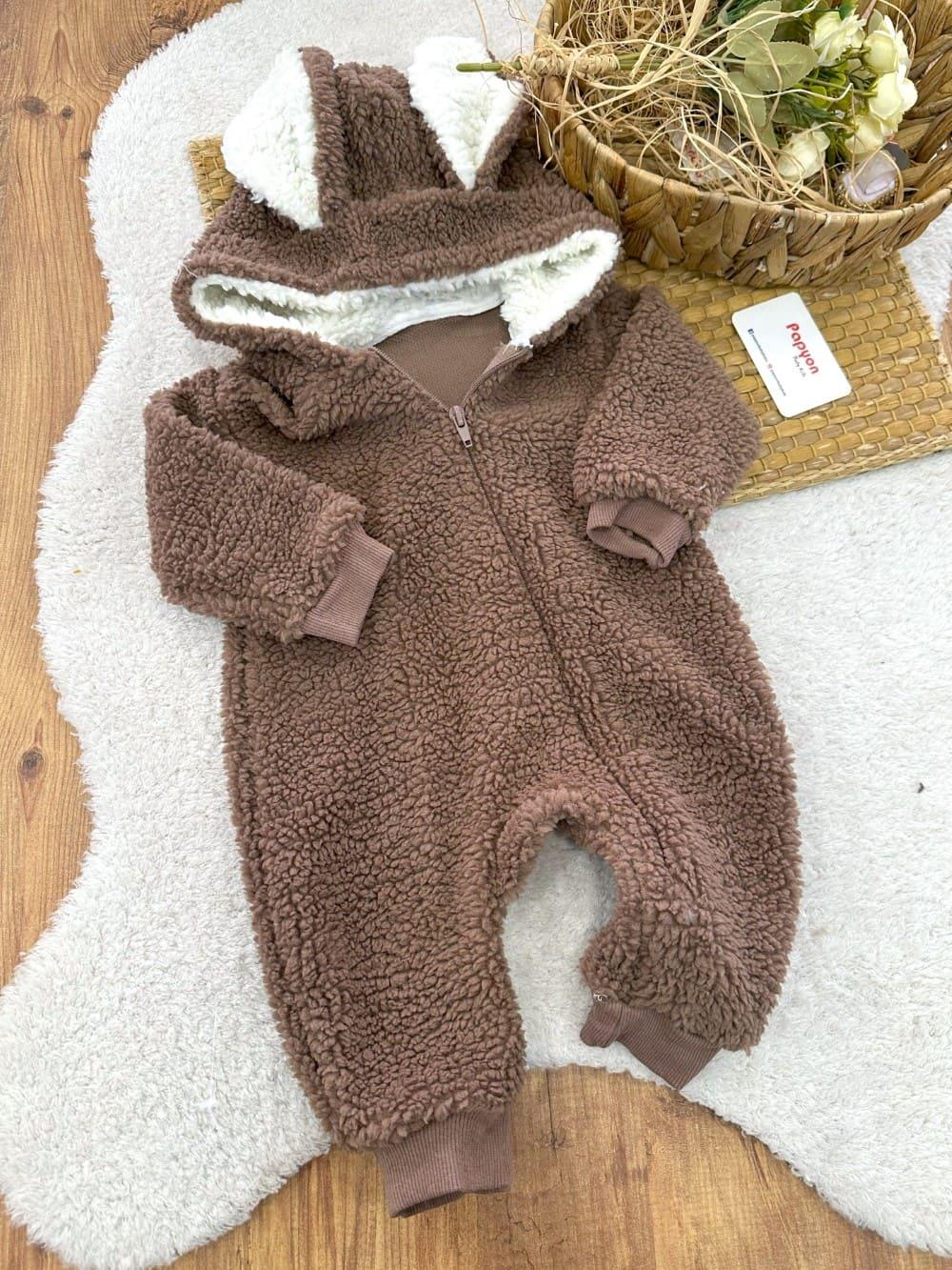 Tavşan Kulaklı Kapşonlu Fermuarlı Bebek Peluş Tulum (0-3/3-6/6-9/9-12 Ay) (MURAT/9847/KAHVE)