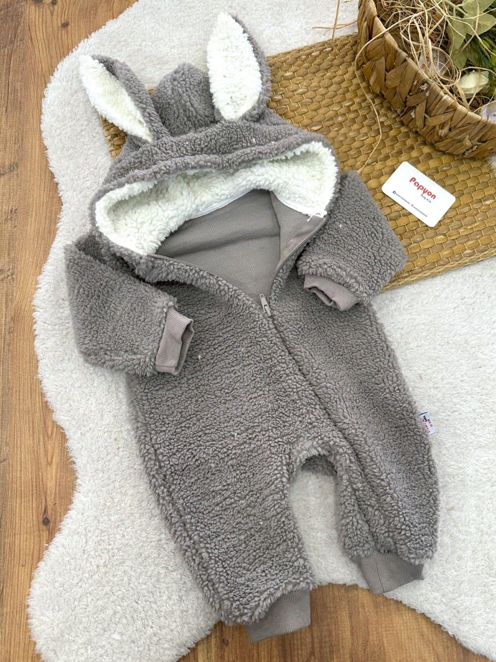 Tavşan Kulaklı Kapşonlu Fermuarlı Bebek Peluş Tulum (0-3/3-6/6-9/9-12 Ay) (MURAT/9847/GRI)