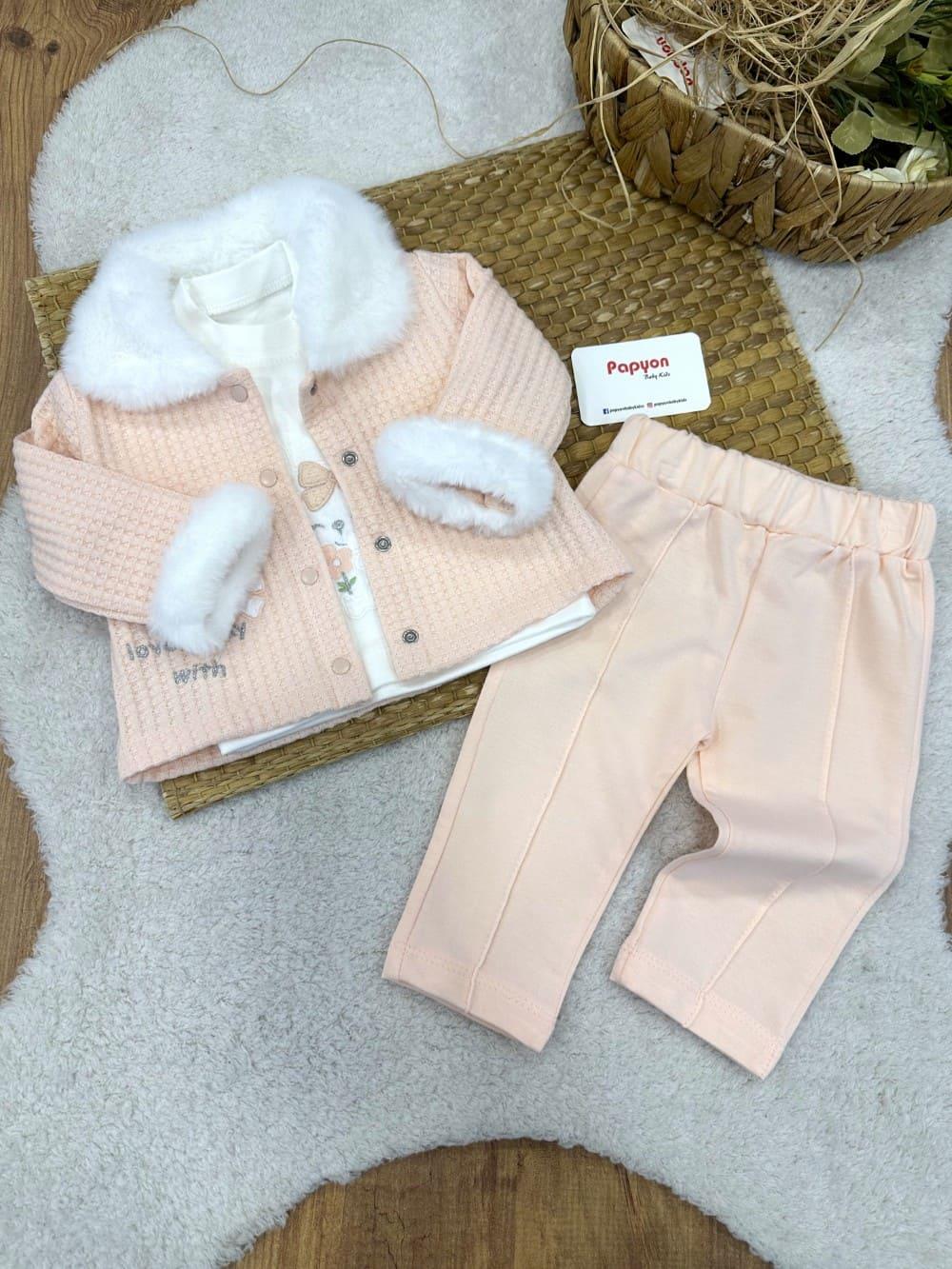 Tavşan Nakışlı Badili Fiyonklu Ceketli Kız Bebek 3lü Takım (3-6/6-9/9-12/12-18 Ay) (ELCI/8423/SOMON)