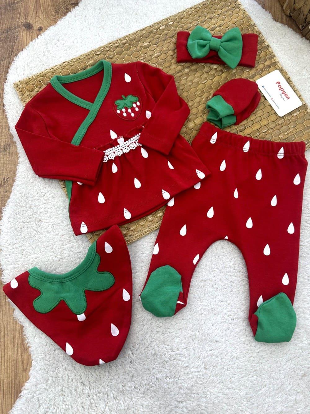 Çilek Nakışlı Dantelli Yenidoğan Kız Bebek 5li Zıbın Set