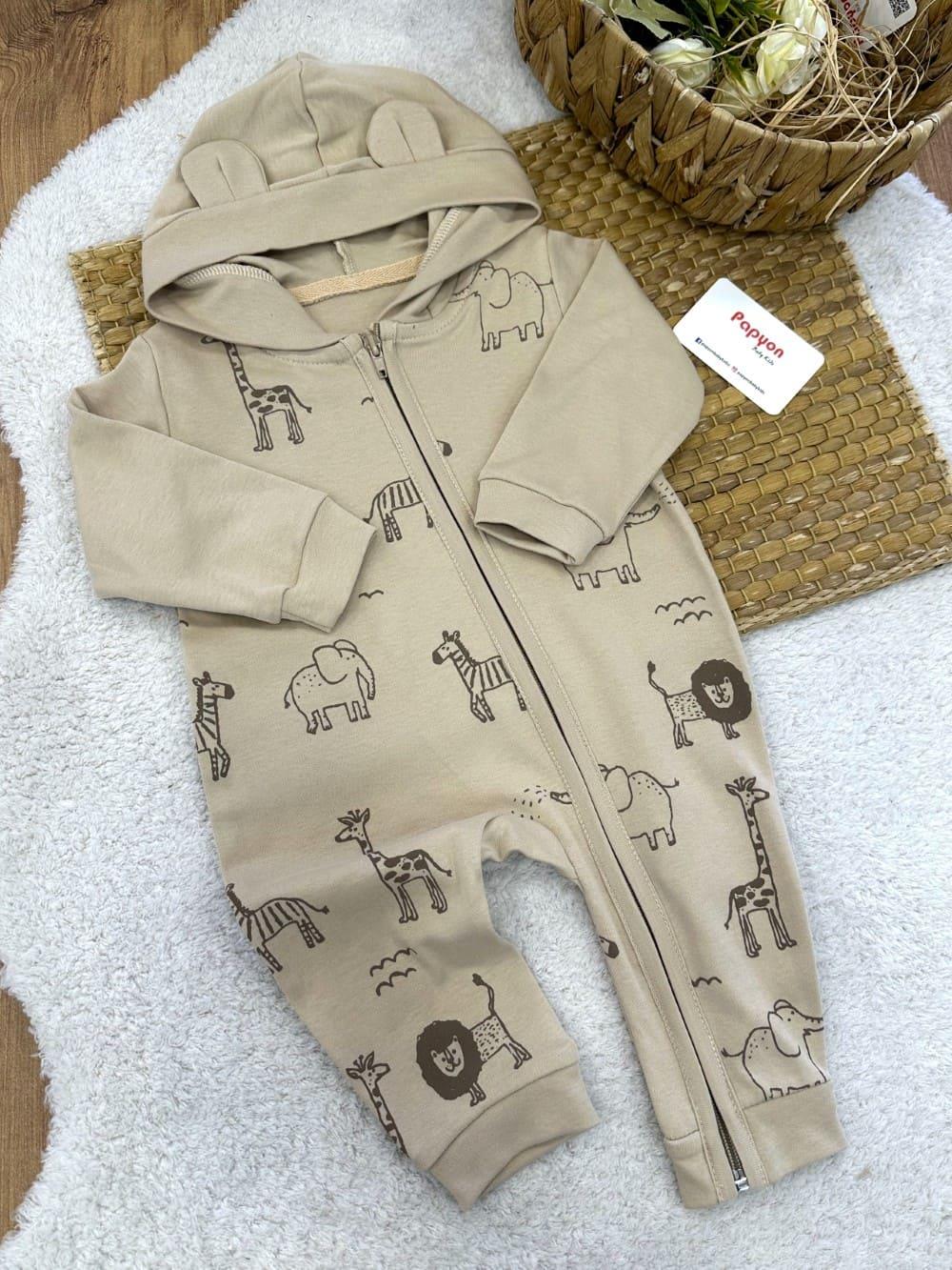 Safari Hayvanları Desenli Kapşonlu Fermuarlı Erkek Bebek Tulum (6-9/9-12/12-18/18-24 Ay) (FLEXI/252417/BEJ)