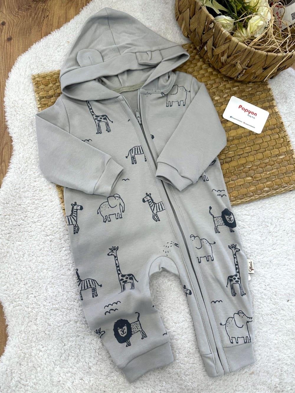 Safari Hayvanları Desenli Kapşonlu Fermuarlı Erkek Bebek Tulum (6-9/9-12/12-18/18-24 Ay) (FLEXI/252417/GRI)