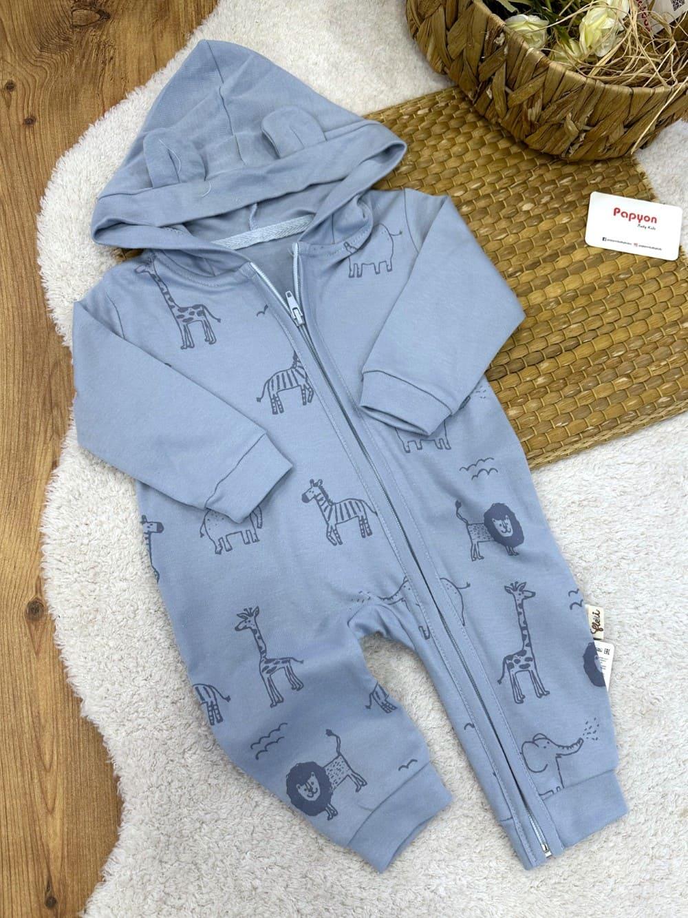 Safari Hayvanları Desenli Kapşonlu Fermuarlı Erkek Bebek Tulum (6-9/9-12/12-18/18-24 Ay) (FLEXI/252417/MAVI)